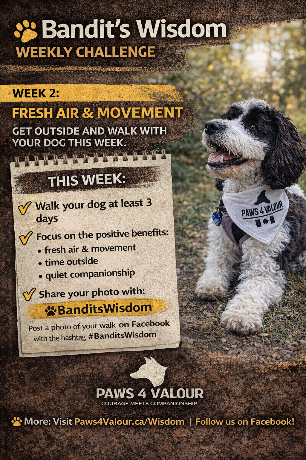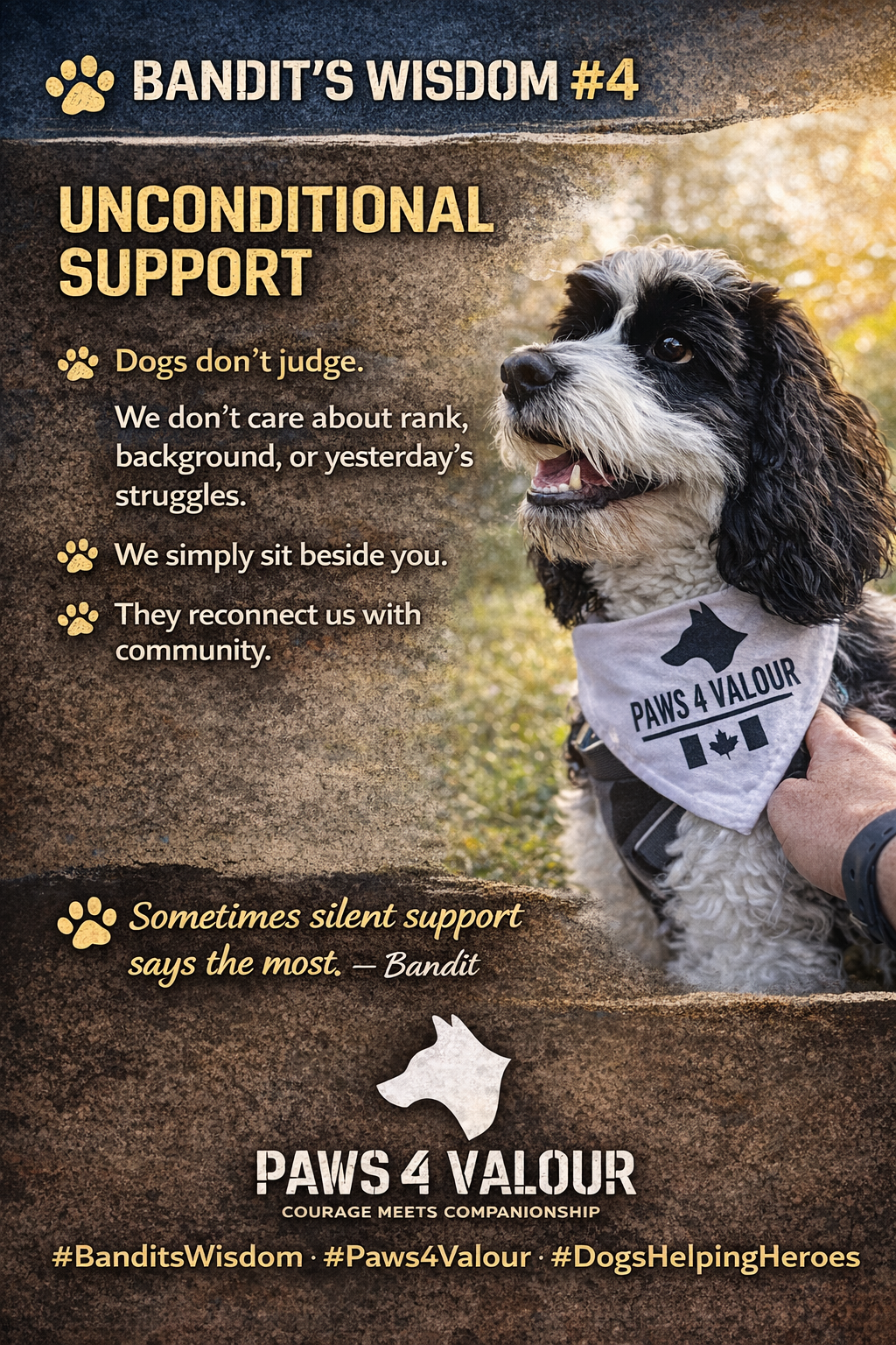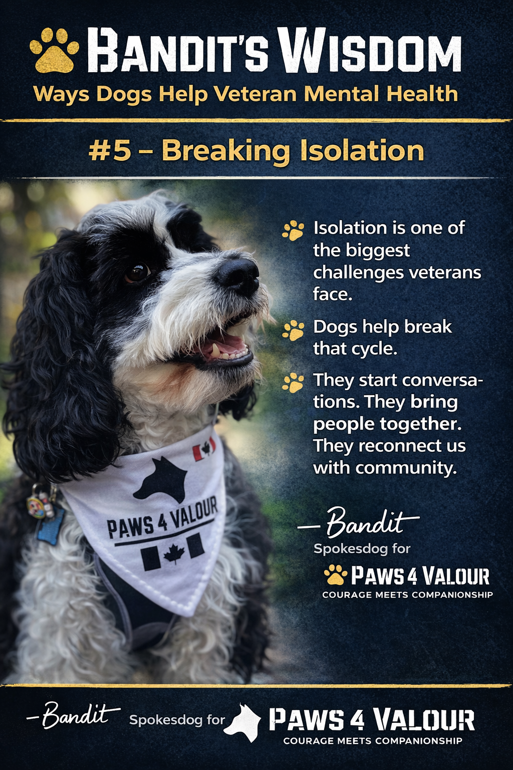 Bandit is the spokesdog for Paws 4 Valour and the face of the Bandit’s Wisdom campaign.