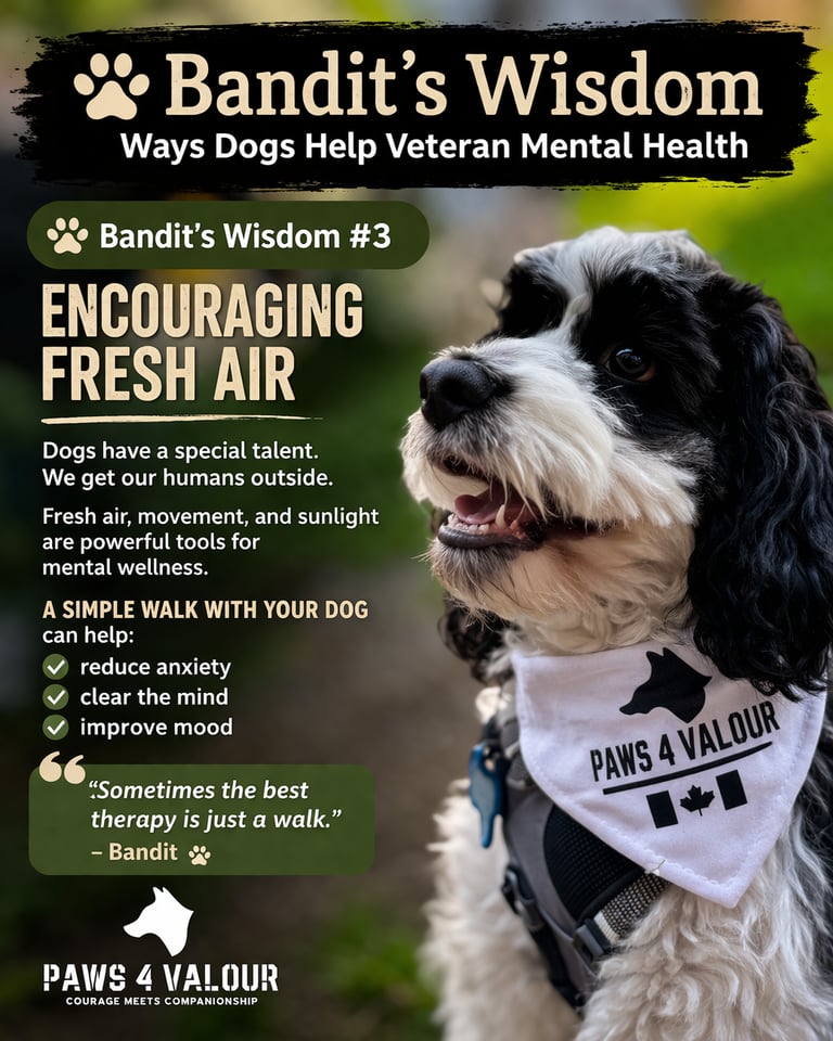 Bandit’s Wisdom shares simple lessons about how dogs can help reduce stress, build routine, encourage movement, strengthen connection, and support healing.